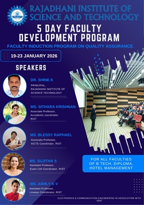 Rajadhani Institute of Science and Technology (RIST) successfully organized a Five-Day Faculty Development Program (FDP) titled “Faculty Induction Program on Quality Assurance” from 19th to 23rd January 2026. The program was conducted for all faculties of B.Tech, Diploma, and Hotel Management programs.