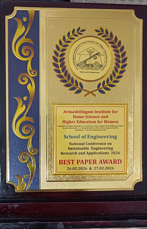 Ms. Blessy Raphael, Associate Professor won “The Best Paper Award” at National Conference on Sustainable Engineering Research 2026 held at Avinashilingam Institute, Coimbatore.